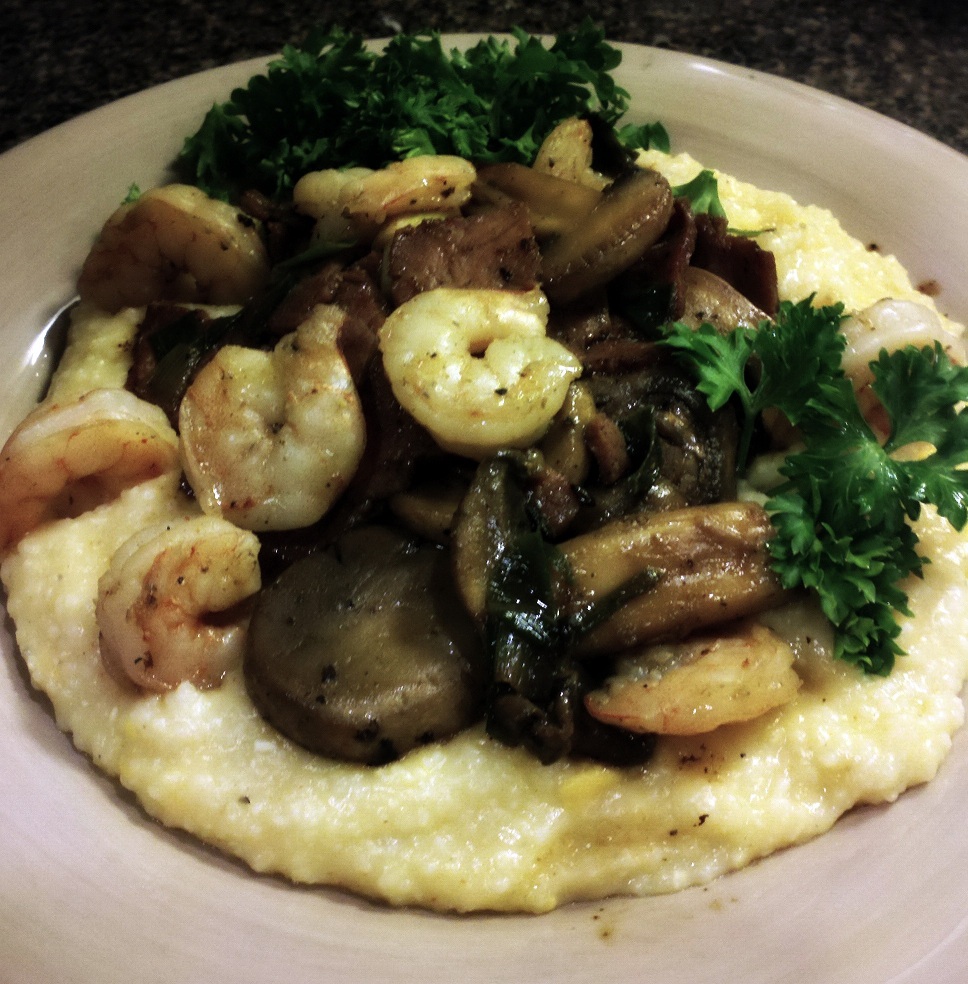 Now it's time to serve!!! Place grits in your bowl, and top with the magic shrimp mixture! Then decorate it up with some parsley!